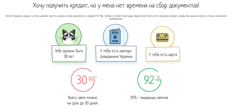 В 2017 году на рынок вышла компания «Кэшинский». Она сразу предложила заемщикам оформить кредит онлайн прямо на карту под 1,9%. Пройти процедуру можно всего за 15 минут без посещения офиса компании. Минимальная сумма 800 гривен, максимальная – 5 000 гривен. Такой сервис стал настоящим открытием для людей, которые хотели быстро взять деньги в долг без каких-либо проблем.