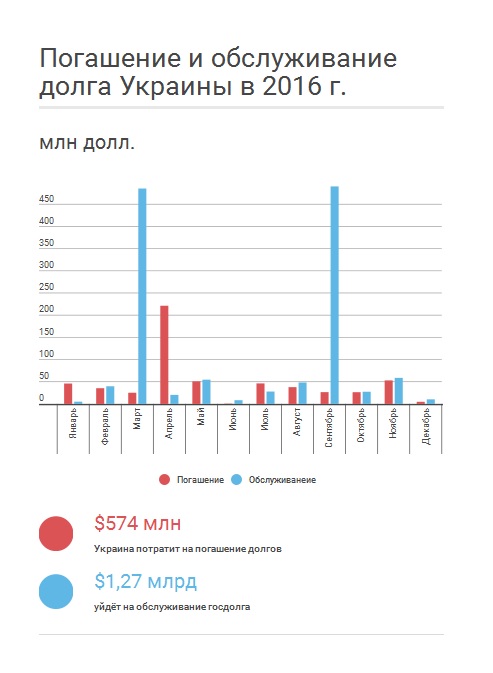 Украина в 2016 году потратит на погашение и обслуживание внешнего долга в целом около $1,7 млрд. При этом наибольшие выплаты придутся на март и сентябрь, когда будет происходить выплата купона по девяти новым выпускам облигаций, выпущенных в соответствии с условиями реструктуризации внешнего коммерческого долга.