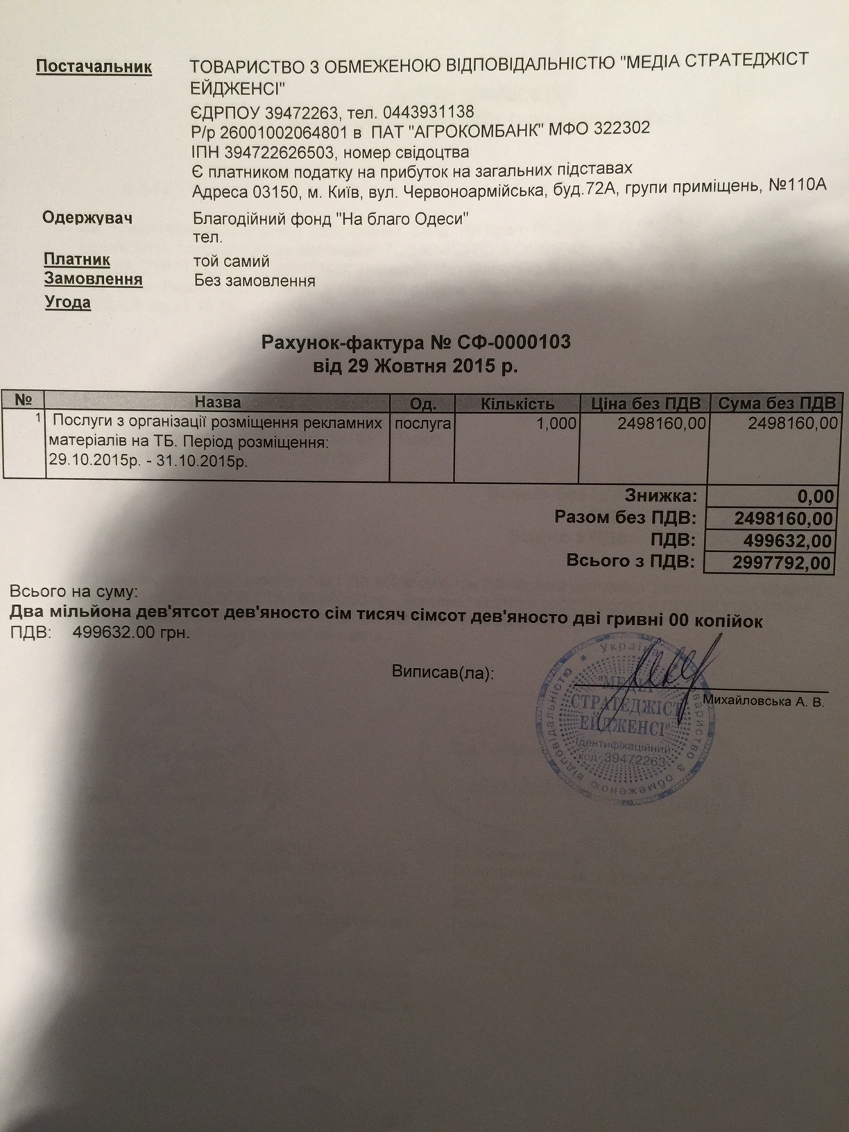 Учредители фонда - крупнейший одесский застройщик сирийского происхождения Аднан Киван и учредитель компании «ТІС-вугілля» Олег Кутателадзе в 2015-м году после взлома почты директора Фонда были вынуждены признать, что финансировали рекламную кампанию Саакашвили. Только за три дня размещения на телеканалах - с 29.10.2015 по 31.10.15 из Фонда было перечислено без малого три миллиона гривен. (Документ - фото) Так же фонд финансировал покупку автомобилей, частные перелеты, и главное пиар-достижение Саакашвили – Административный центр.