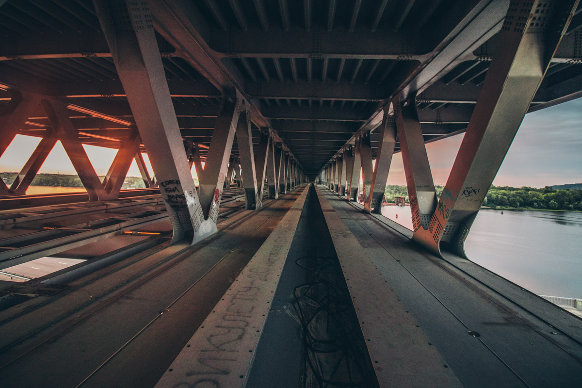 Кажется, что мост после ночи открывает все свои тайны. Могучая спина железного «динозавра» выглядит интересно и немного пугающе.