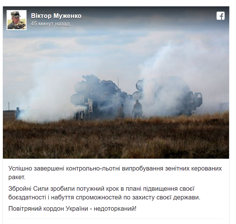"Успешно завершены контрольно-летные испытания зенитных управляемых ракет. Вооруженные Силы сделали важный шаг в плане повышения своей боеспособности и приобретения опыта по защите своего государства. Воздушная граница Украины - неприкасаема!" - написал Муженко.