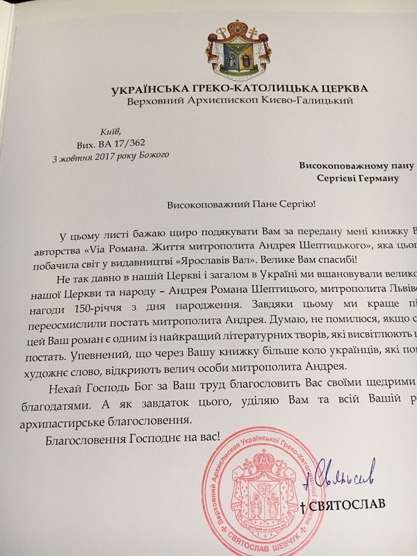 Глава УГКЦ Блаженнійший Святослав назвав роман Сергія Германа найкращим, що написано про Андрея Шептицького. Про це йдеться у листі Блаженнійшого Святослава до автрора.