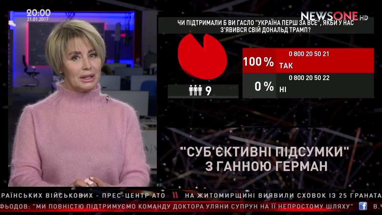 У прямому ефірі “Суб’єктивних підсумків” з Ганною Герман на телеканалі “NewsOne” українці голосували щодо того, чи підтримали б вони гасло “Україна перш за все”, якби у нас з'явився політик такого кшталту, як Дональд Трамп. До студії надійшло 16 491 голосів українців.