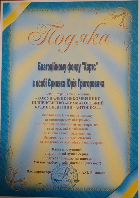 Юрий Ериняк и волонтеры его фонда не смогли лично посетить детский дом ввиду действия карантина из-за пандемии коронавируса, однако смогли доставить помощь детям, которые получили средства личной гигиены, памперсы, стиральный порошок, салфетки, детский крем, мыло.