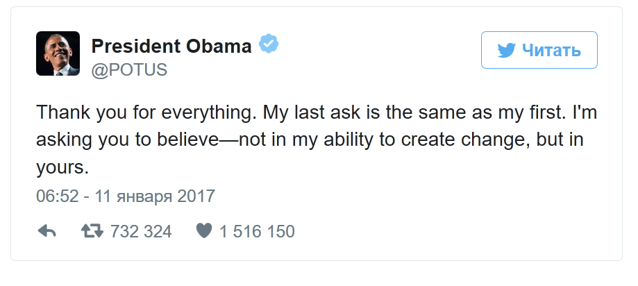 "Спасибо за все. Моя последняя просьба такая же, как и первая. Я прошу вас верить - не в мои способности что-то менять, но в ваши", - написал уходящий президент в микроблоге.